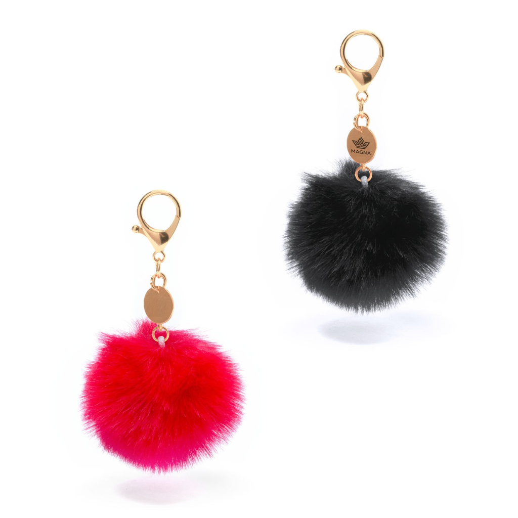 Llavero pom pom con chapa dorada.